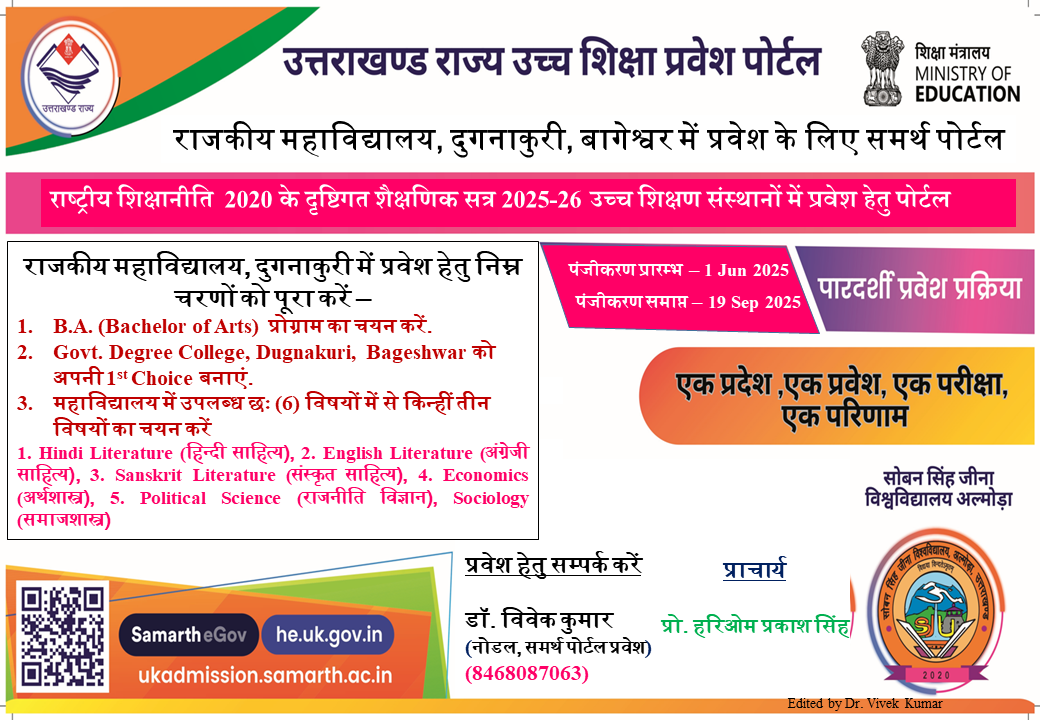 राजकीय महाविद्यालय, दुगनाकुरी में सत्र 2025-26 के लिए स्नातक (B.A.) में प्रवेश लेने के लिए आप सभी विद्यार्थियों का स्वागत है । प्रस्तुत महाविद्यालय में प्रवेश के लिए आपको समर्थ पोर्टल - ukadmission.samarth.ac.in से पंजीकरण करना अनिवार्य होगा । जिसे आप अपने घर बैठे या नजदीकी CSC केन्द्र पर जाकर भी कर सकते हैं । ऑनलाइन आवेदन की तिथि 01 जून से 19 सितम्बर (11:55PM) 2025 है । महाविद्यालय में प्रवेश से सम्बन्धित किसी भी जानकारी के लिए बैनर पर दिये मोबाईल नम्बर पर फोन कर सकते हैं ।